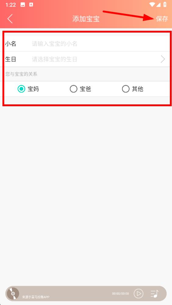 4、选择后,进入信息填写页面,输入宝宝小名、选择宝宝生日并选择您与宝宝的关系,填写完成后点击右上角的保存,即可成功添加宝宝信息。
