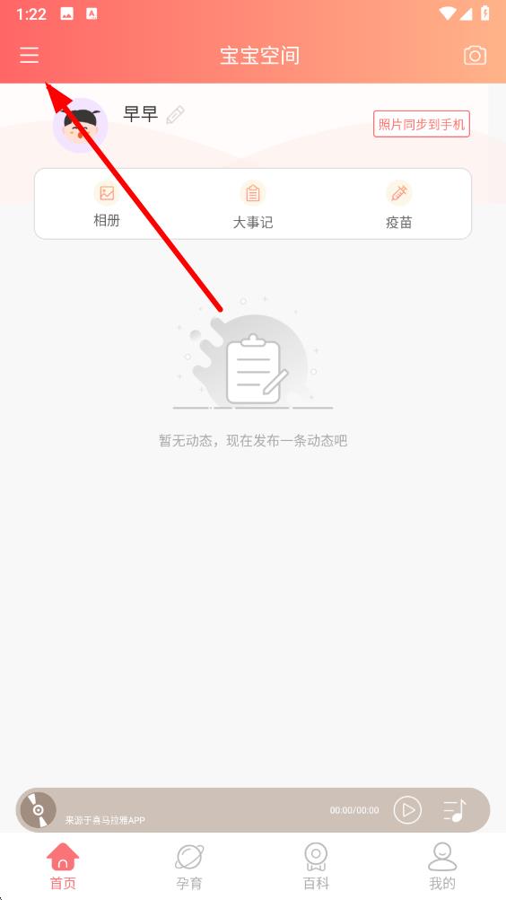 1、打开亲宝贝app,在首页点击左上角的三条横线图标,打开隐藏菜单。
