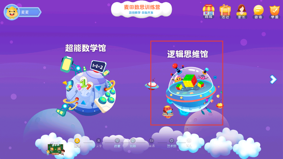 2、在麦田数思训练营页面,点击逻辑思维馆,进入逻辑思维学习场景。