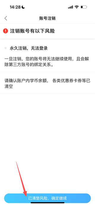 4、在账号注销风险提示页面,点击已清楚风险,进入注销信息填写页面。