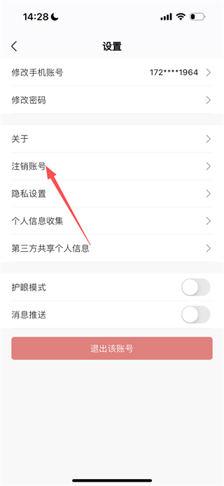 3、在设置页面,点击注销账号选项,进入账号注销风险提示页面。