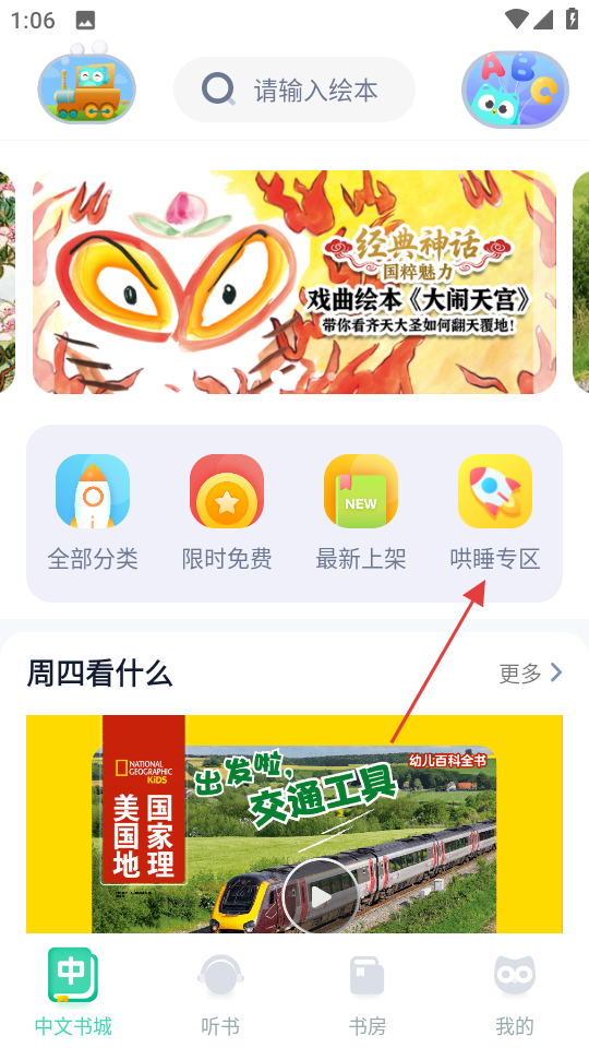 1、在中文书城页面,点击哄睡专区按钮,进入哄睡专区。