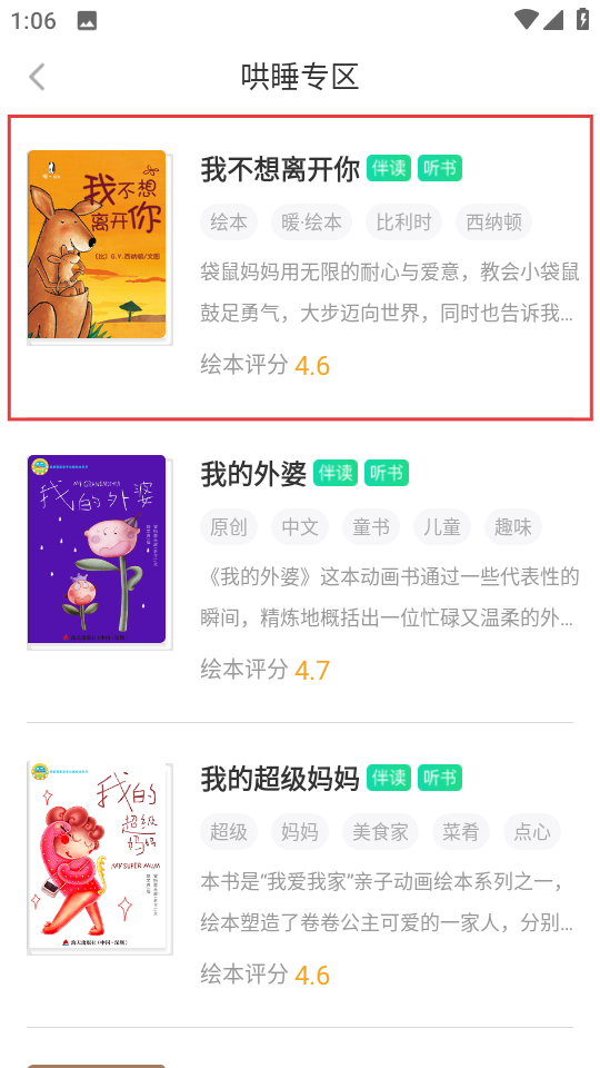 2、在哄睡专区,点击我不想离开你绘本,进入该绘本详情页。