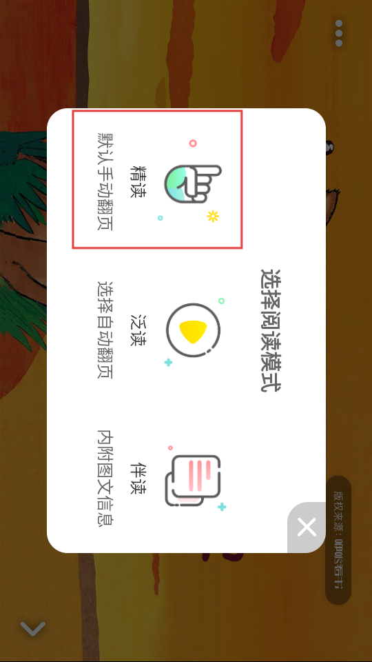 4、在阅读模式选择界面,点击精读选项,以默认手动翻页模式阅读绘本。