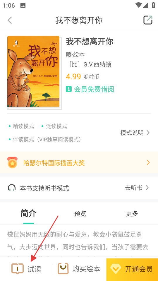 3、在我不想离开你绘本详情页,点击试读按钮,进入阅读模式选择界面。