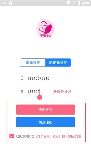 4、勾选已阅读并同意相关协议选项后,可选择快速登录或注册按钮完成账号操作。