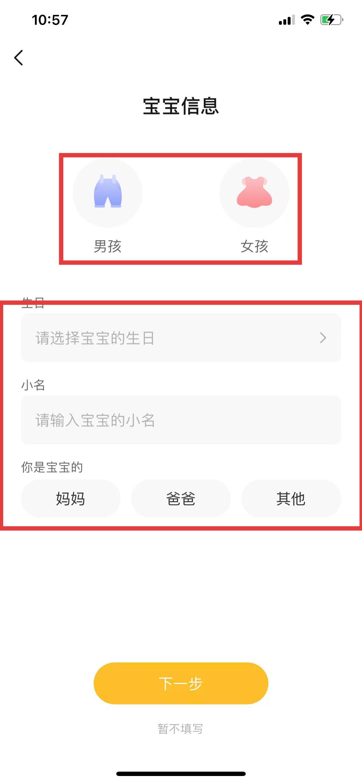4、进入添加家庭成员页面,填写宝宝信息,即可成功添加第二个宝宝信息。