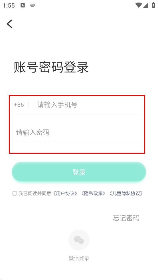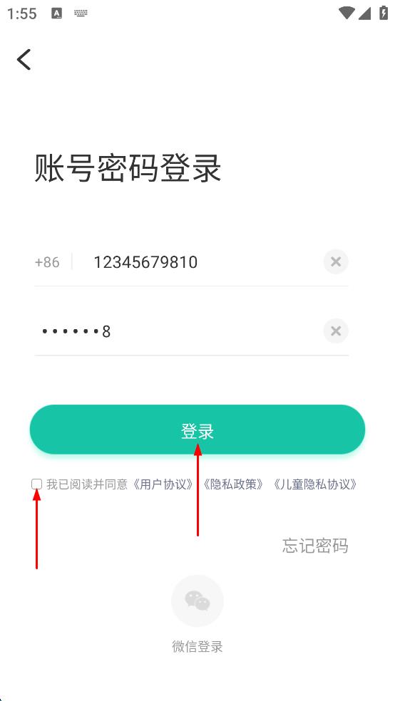 4、填写好手机号和密码后,勾选“我已阅读并同意用户协议,隐私政策,儿童隐私协议选项,然后点击“登录”按钮,即可尝试登录掌心宝贝app。
