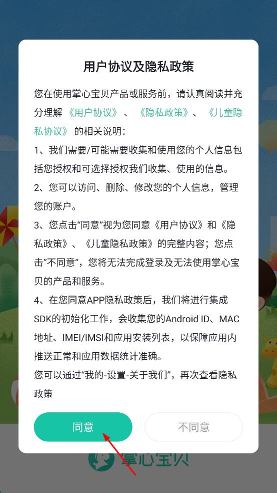 1、打开掌心宝贝app,会弹出用户协议及隐私政策提示框,仔细阅读相关内容后,若同意,点击“同意”按钮。