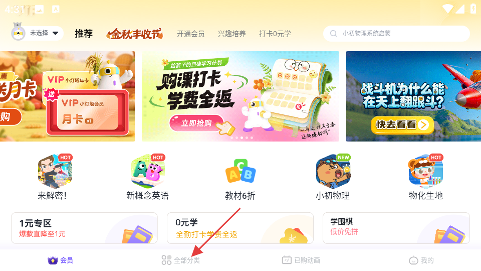 1、打开小灯塔,在首页点击全部分类,进入课程分类页面。
