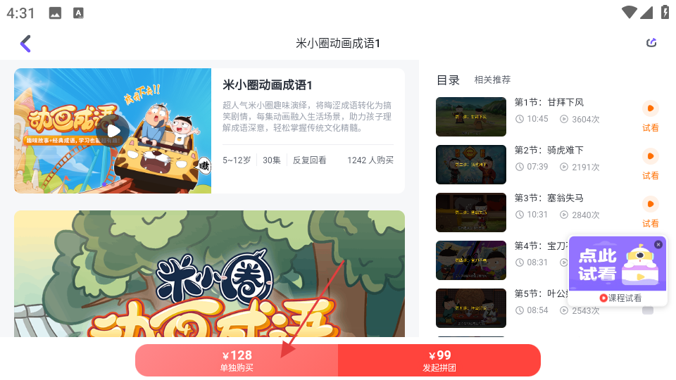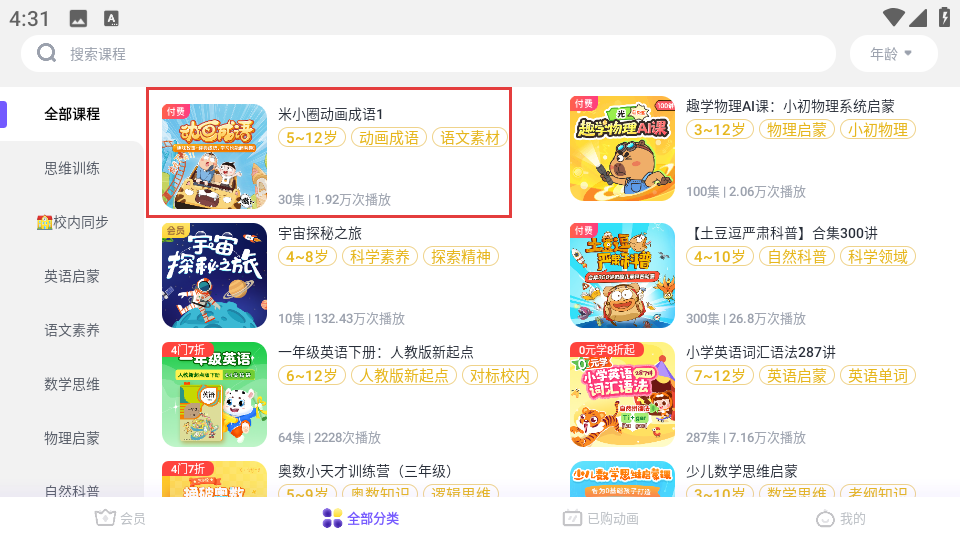 2、在课程分类页面,选择米小圈动画成语1课程,进入课程详情页。