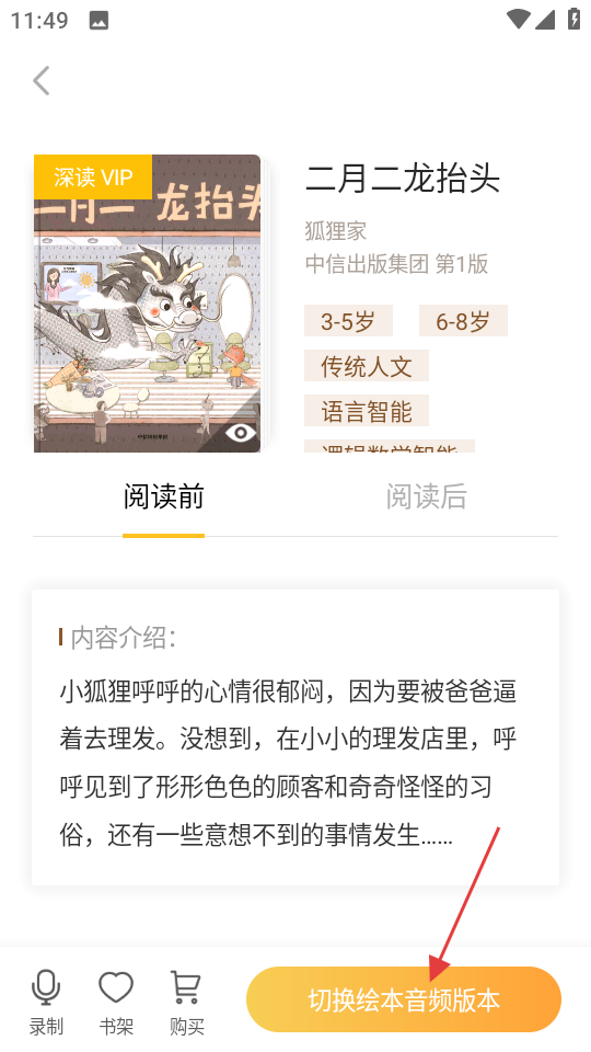 4、在二月二龙抬头绘本详情页,点击切换绘本音频版本按钮,可听此绘本。