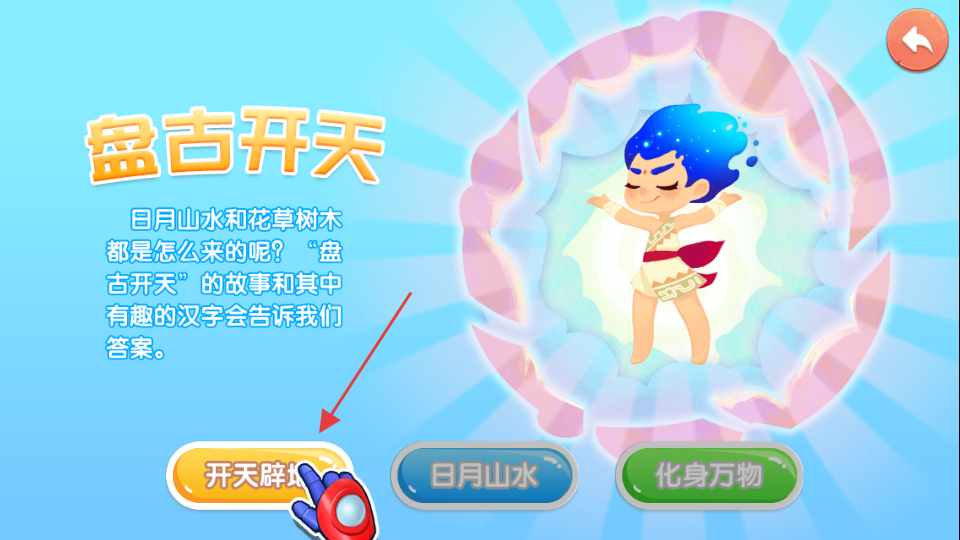 3、进入盘古开天页面后,点击开天辟地按钮,开启相关故事内容。