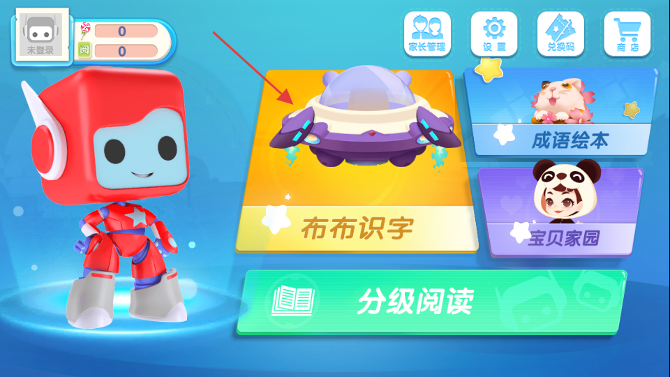 1、在软件主界面,点击布布识字按钮,进入识字相关场景。
