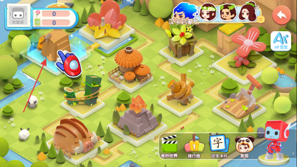 2、在汉字启蒙上场景中,跟随指引点击相应建筑,推进内容。