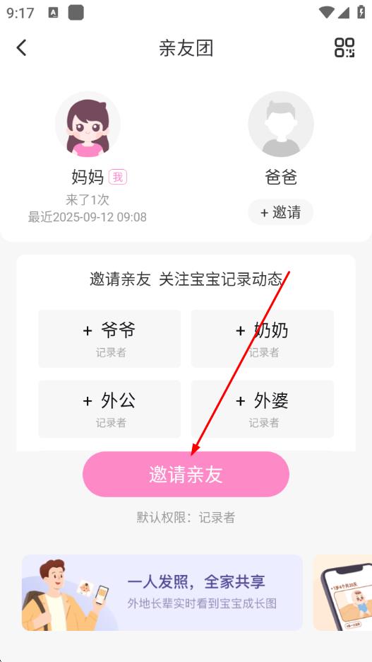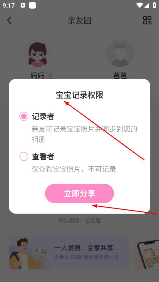 4、选择亲友的权限,点击立即分享,通过分享链接等方式邀请亲友加入。