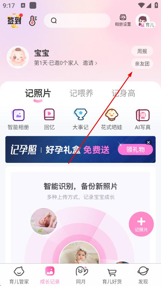 2、在“成长记录”页面,点击右侧的亲友团按钮。