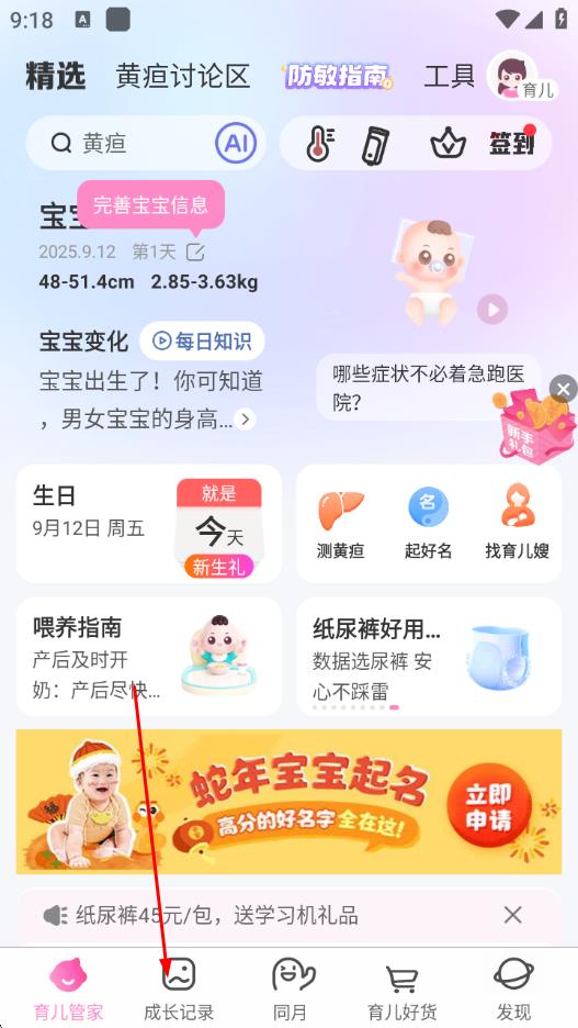 1、打开妈妈网孕育应用,点击底部导航栏中的成长记录选项。