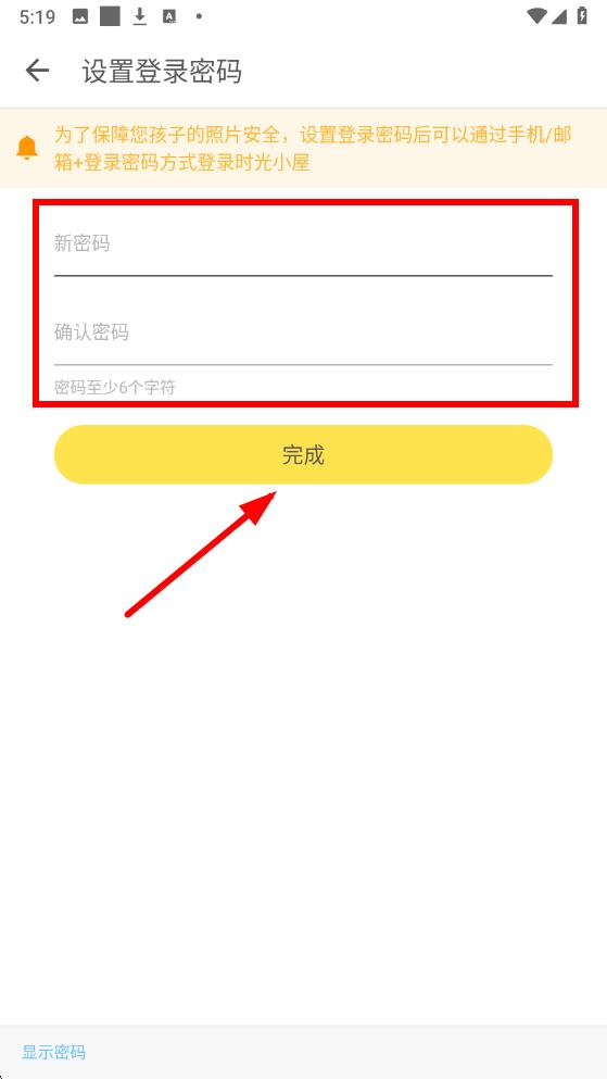 3、在设置登录密码页面,依次输入新密码和确认密码,输入完成后点击完成按钮即可完成密码设置。