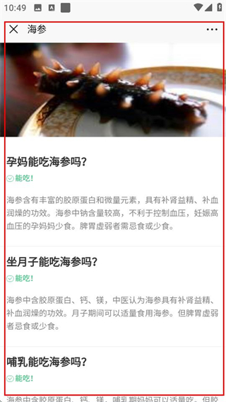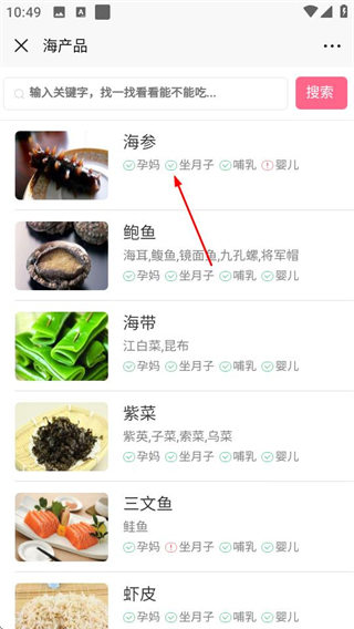 3、在海产品列表页面,选择要查看的食物,如海参,进入食物详情页面。