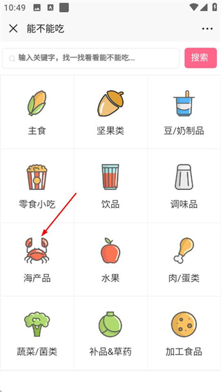 2、在食物分类页面,选择食物类别,如海产品,进入海产品列表页面。
