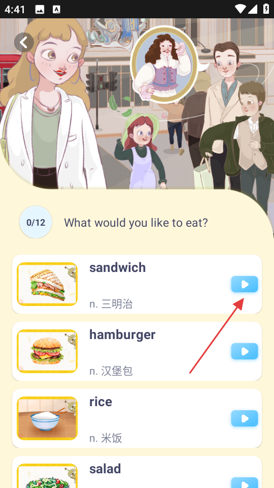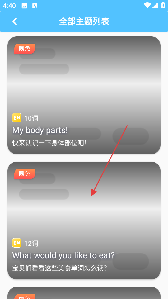 2、在全部主题列表中,选择你想吃点什么主题,进入该主题单词学习页。