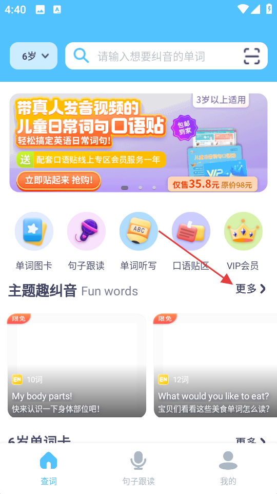 1、在查词页面,点击主题趣纠音旁的更多,进入全部主题列表。