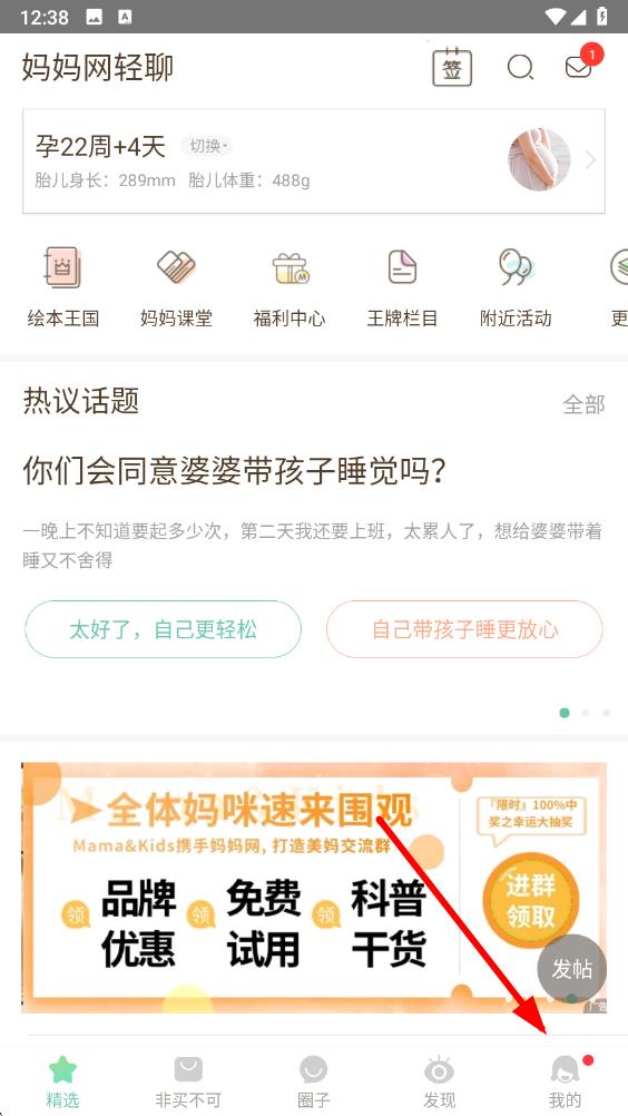 1、打开妈妈网轻聊app,点击底部导航栏最右侧标有我的的图标,进入个人相关界面。