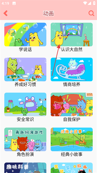 2、在动画分类页面,选择动画分类,如认识大自然,进入该分类下的动画列表页面。