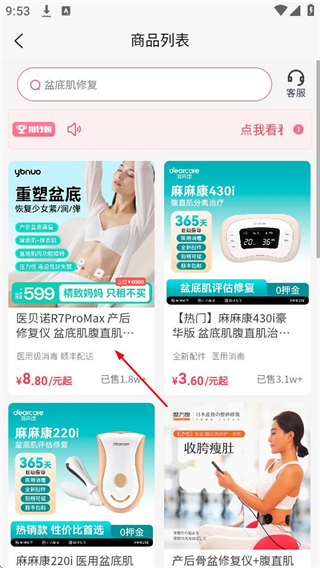 1、打开医小租,点击产后修复,可进入产后修复商品列表页面。