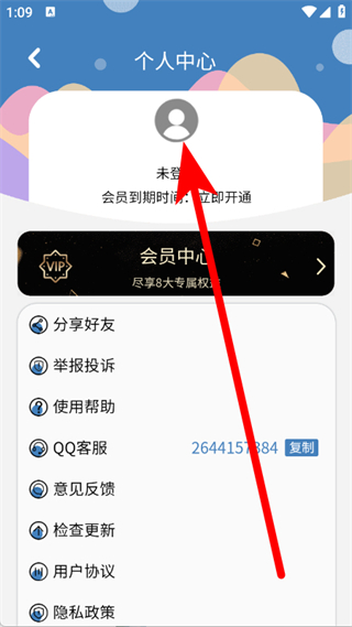2、在个人中心页面,点击未登录的头像区域,进入登录界面。