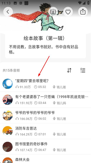 3、在绘本故事列表页面,选择要收听的故事,进入故事播放页面。