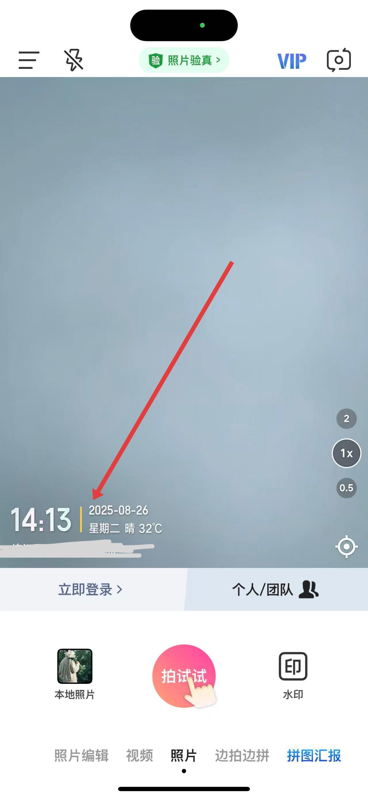 1、打开软件进入拍摄界面,点击左下角时间天气信息区域,可开启水印编辑流程。