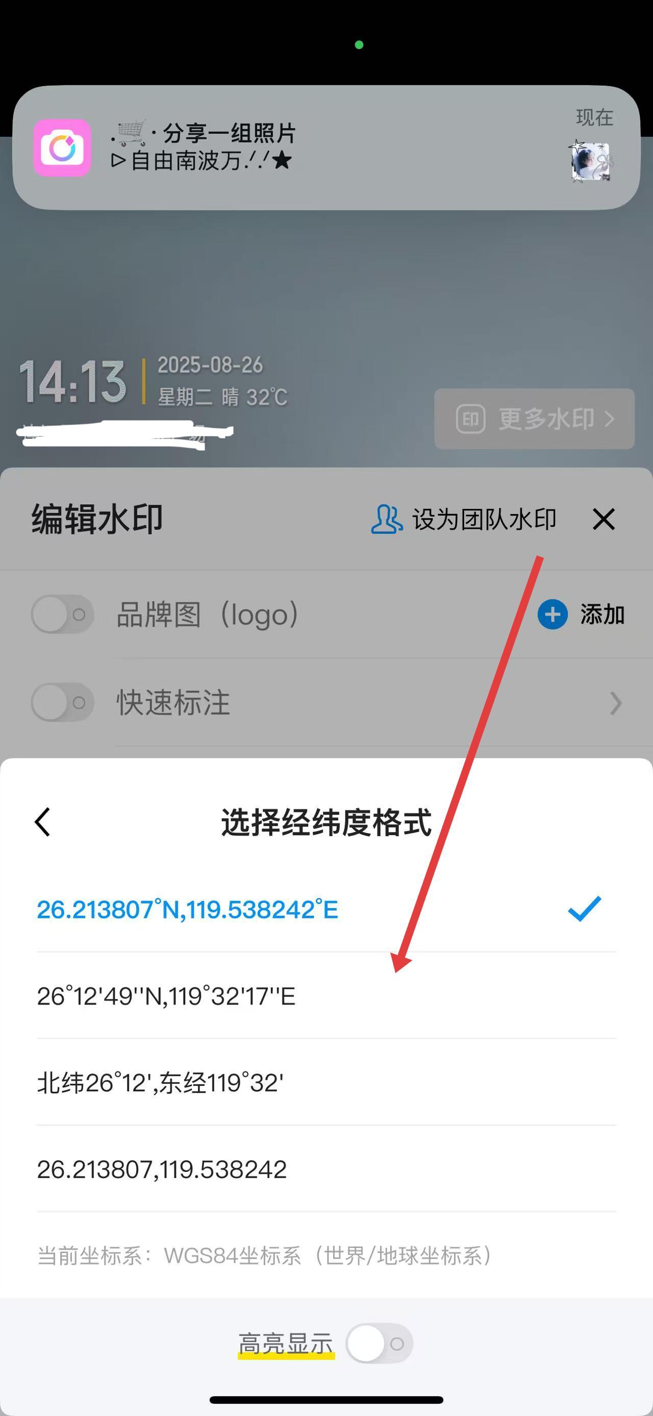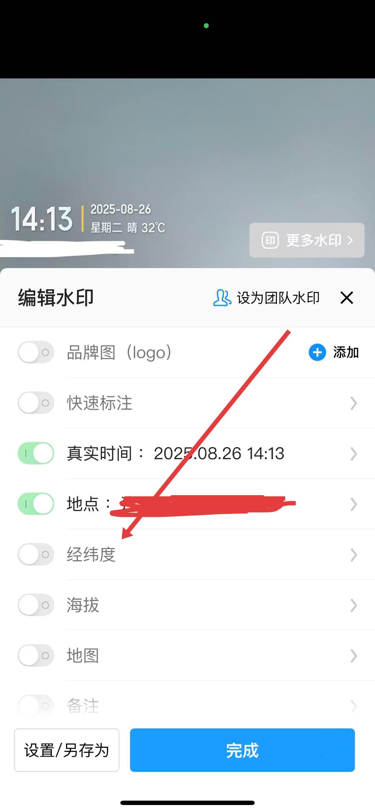 2、在编辑水印界面,找到经纬度选项,开启开关后可设置经纬度显示相关内容。