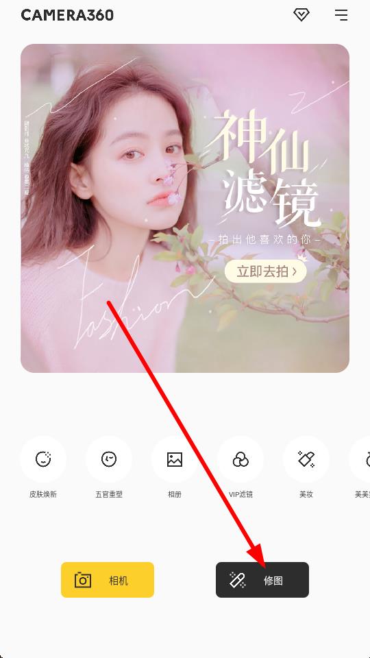 1、打开CAMERA360,点击下方修图按钮进入修图流程。