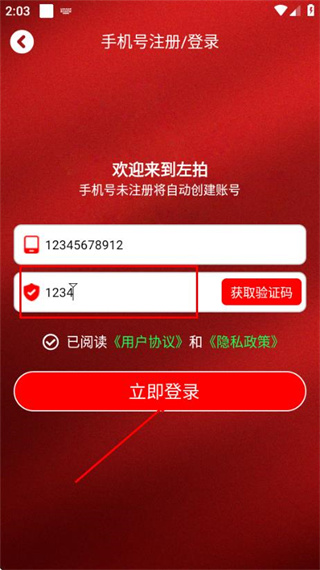1、在左拍的登录页面,点击手机号登录选项,进入手机号登录页面。