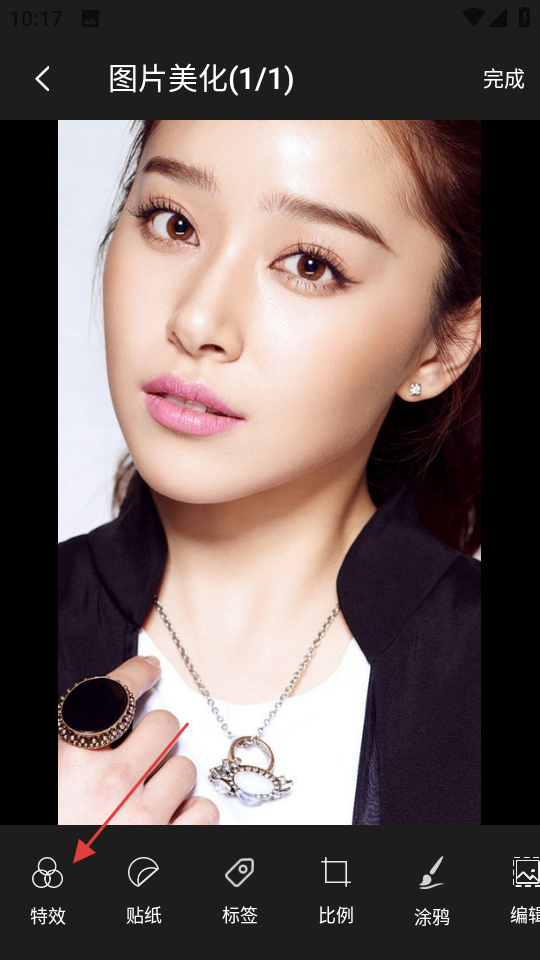 3、在图片美化页面,点击特效,进入滤镜选择页面。