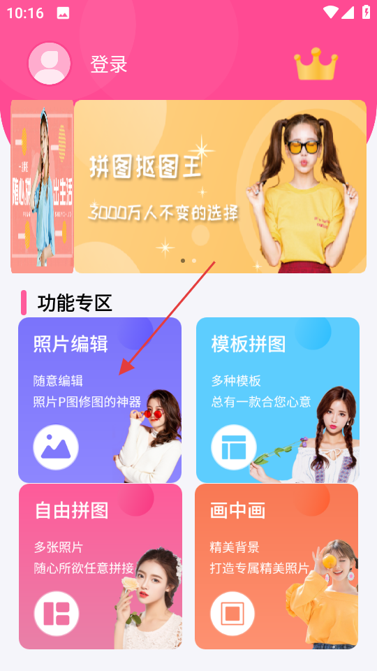 1、在首页功能专区,点击照片编辑,进入所有图片选择页面。