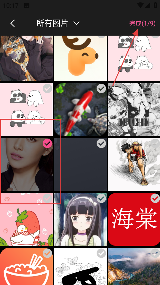 2、在所有图片选择页面,选择要编辑的图片,点击完成,进入图片美化页面。