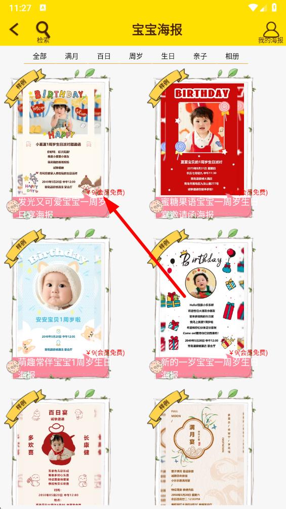 2、在宝宝海报模板选择页面,挑选心仪的海报模板并点击进入。