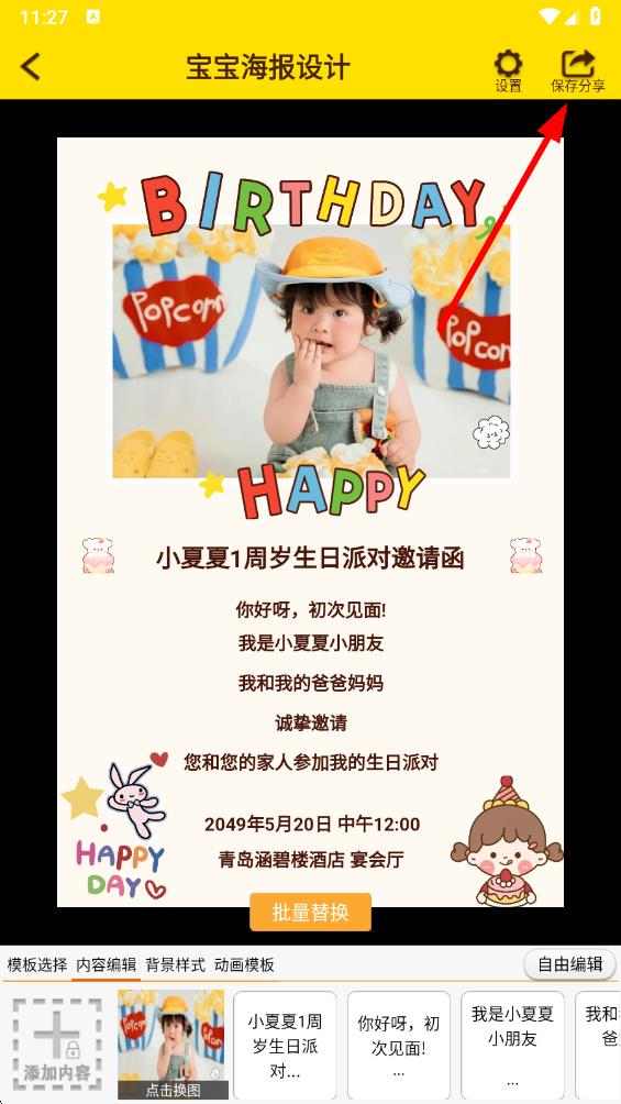 4、定制完成后,点击右上角保存分享,即可完成宝宝海报制作。