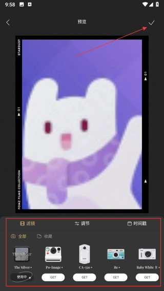 4、在图片预览界面,可选择滤镜等效果进行调整,调整完毕后点击右上角的对勾按钮。