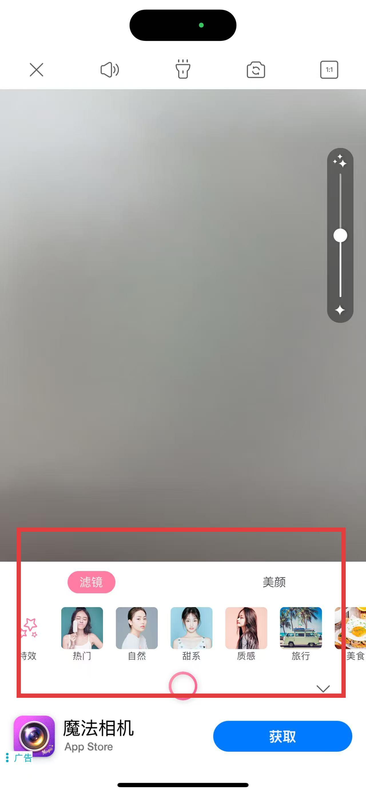 2、在拍摄界面中,下方有滤镜、美颜等选项,可根据需求选择合适的滤镜风格或调整美颜效果,来优化拍摄效果。