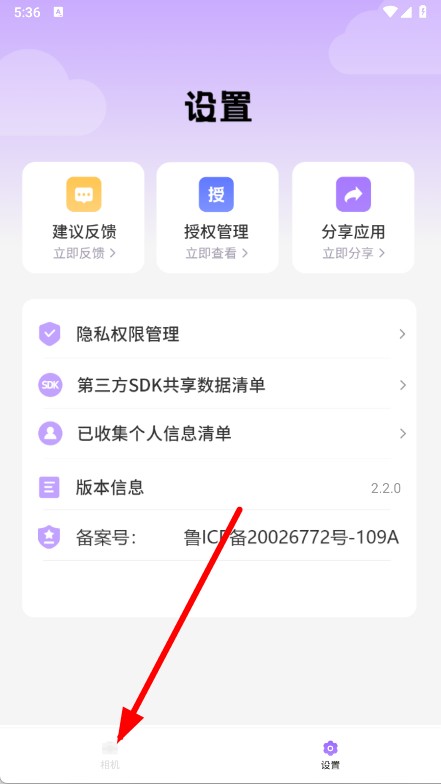 1、打开照相机高清,在设置页面点击底部的相机选项,进入高清相机功能页面。