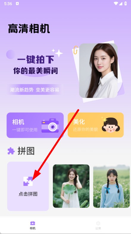 2、在高清相机页面,点击拼图选项,进入选择图片页面。