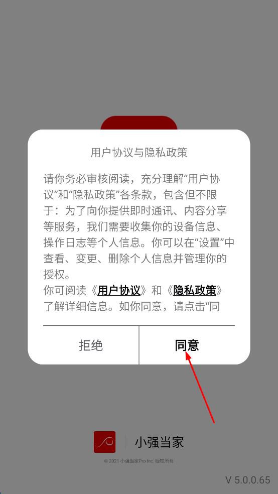 1、打开小强当家APP,在弹出的用户协议与隐私政策提示框中,点击“同意”按钮。