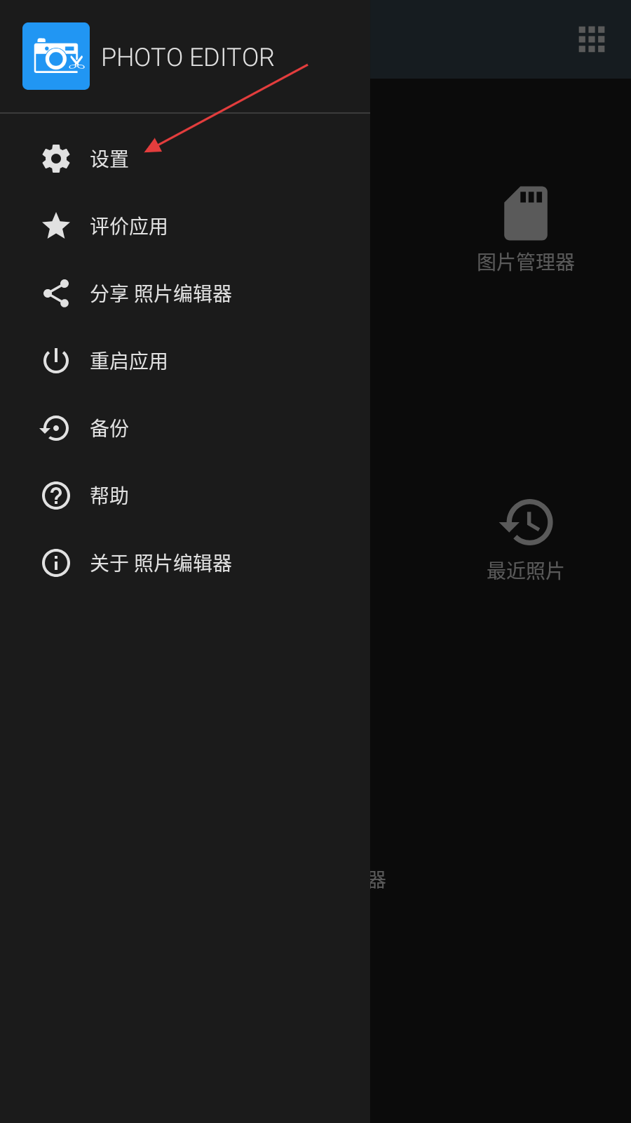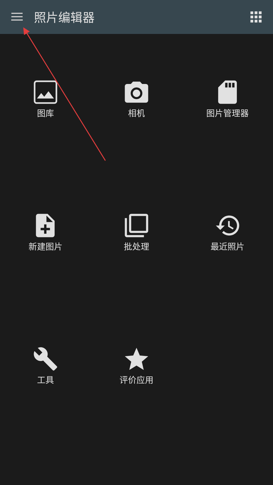1、打开照片编辑器,点击界面左上角的菜单按钮,展开侧边栏菜单。