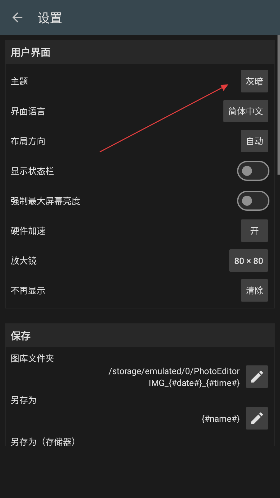 3、在设置界面的用户界面板块下,找到主题选项,点击其右侧的按钮。