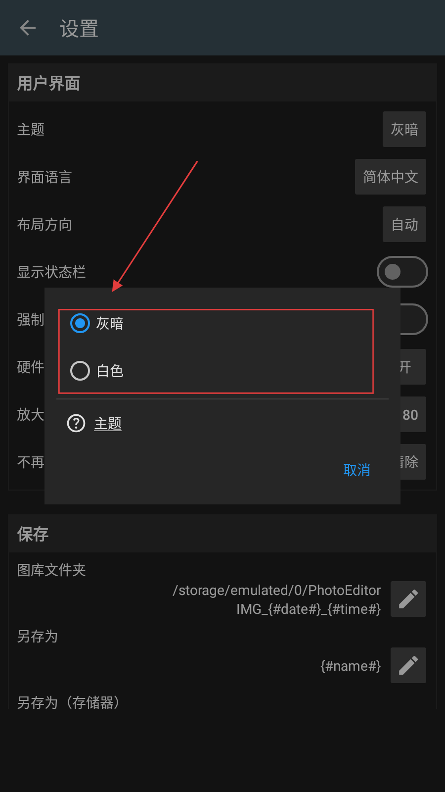 4、在主题选择窗口中,根据需求选择灰暗或白色主题,即可完成主题颜色的更改。