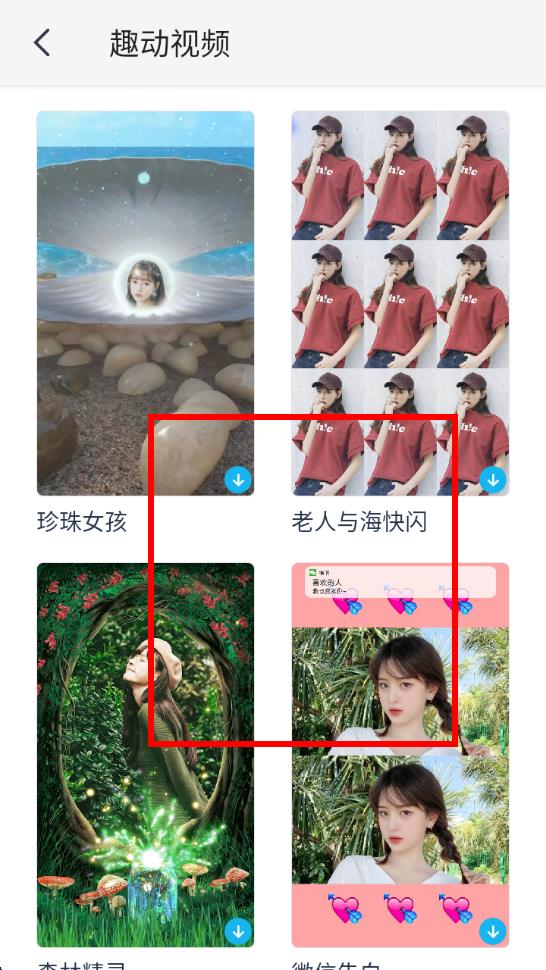 2、在趣动视频页面中,浏览众多视频模板,选择如老人与海快闪等自己喜欢的模板。